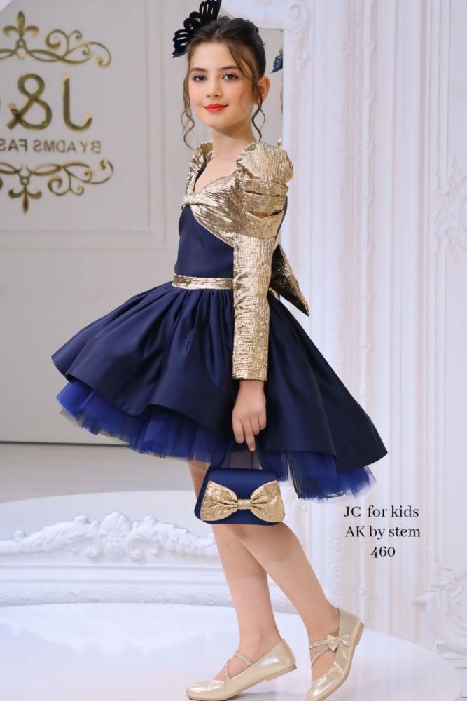 أضيفي لمسة من التألق الكلاسيكي لمناسبات طفلتك مع هذا الفستان الفاخر. يجمع هذا التصميم الجذاب بين فخامة اللون الكحلي الداكن (أو الأزرق البحري) وبريق الذهبي اللامع (الجليتر). يتميز الجزء العلوي بأكمام طويلة وتفاصيل كتف منتفخة من قماش ذهبي براق، مع تصميم عقدة أنيقة باللون الكحلي على الصدر. التنورة قصيرة ومنفوشة بقصة الباليرينا، تتكون من طبقات ساتانية من الكحلي، وتبرز بطبقة من التول الكحلي في الأسفل لإضافة الحجم والنفشة الدرامية. هذا الفستان هو الخيار الأمثل للمناسبات المسائية، وحفلات رأس السنة، وأعياد الميلاد الفخمة.