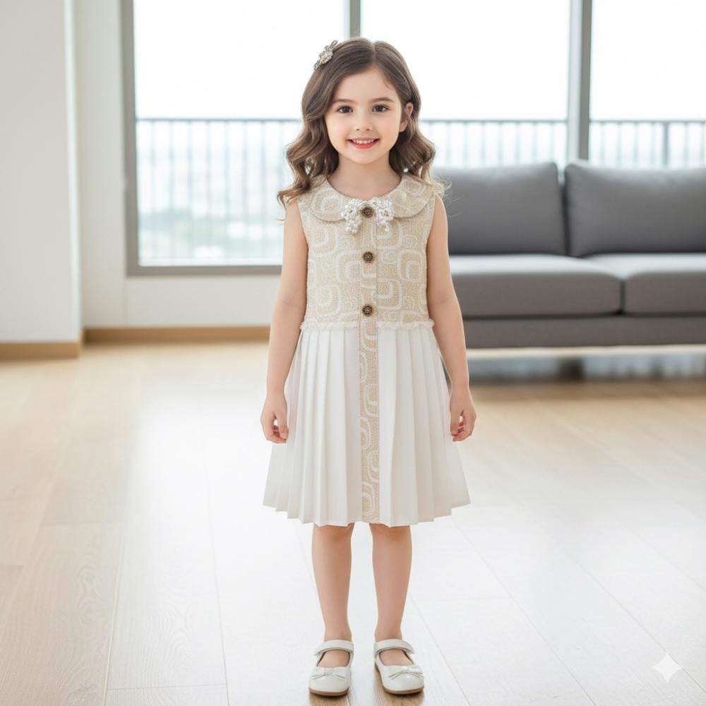 فستان بناتي أنيق باللون الأبيض والذهبي بتصميم ناعم وفخم يناسب المناسبات والحفلات. يتميز الفستان بجزء علوي مزخرف بتطريز ذهبي فاخر مع ياقة أنيقة مزينة بحبات اللؤلؤ، وتنورة بيضاء منفوشة بخفة لطلّة ملكية. خامة مريحة وناعمة على بشرة الطفل، مناسب للأعياد والزيارات والمناسبات الخاصة. أفضل اختيار للأم الباحثة عن الأناقة والبساطة في آن واحد
